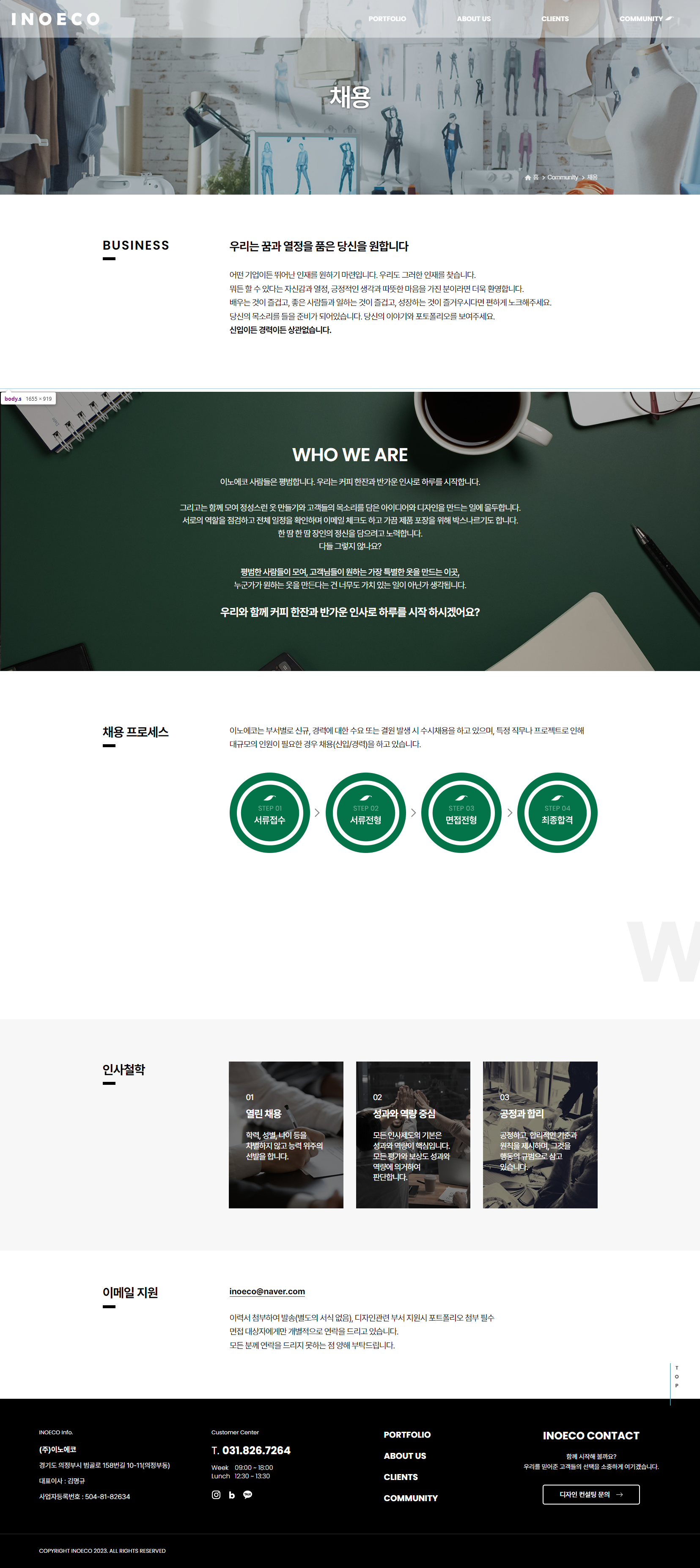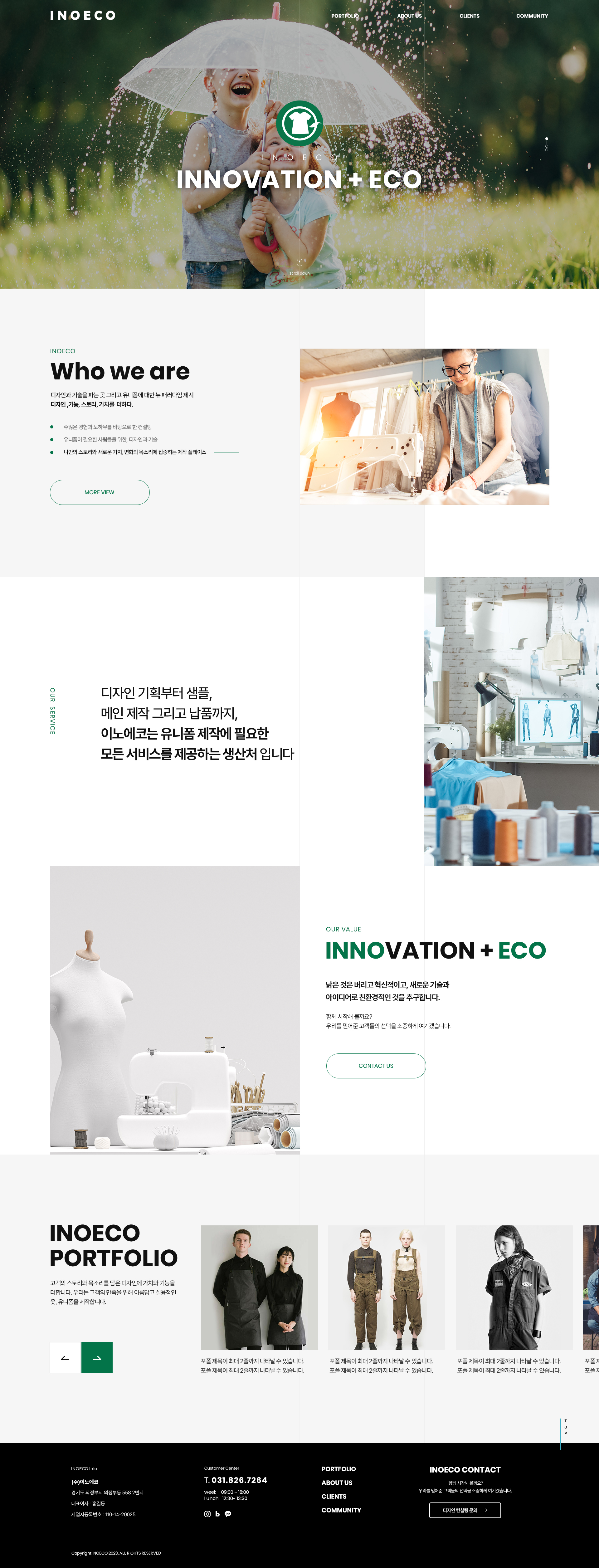 또한 계속 있을 주문 제작건들에 대한 포트폴리오와 협력업체들을 직접 관리자페이지에서 관리할 수 있도록 개발해드렸으며, 이노에코만의 Brand Story를 담을 수 있는 INOLOG 페이지를 통해 직접 브랜드 홍보를 할 수 있도록 개발해드렸습니다.