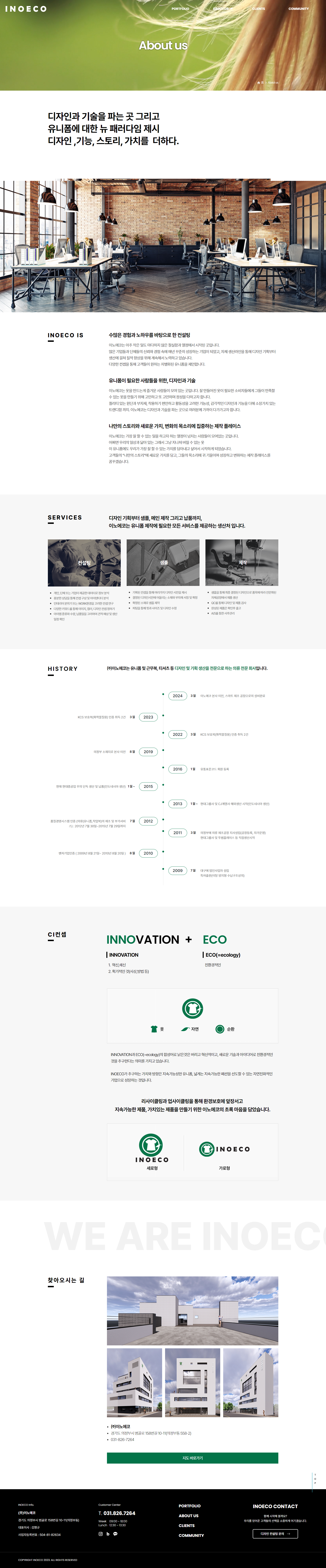 2024년 회사 사옥 건축 완공을 앞두고 (주)이노에코라는 회사에 대한 브랜드를 홍보하고 B2C로의 확장을 목표로 홈페이지 제작을 진행한 만큼 이노에코만의 심플하고 모던하면서도 유니크하고 세련된 브랜드를 홈페이지에 표현하고자 노력하였습니다.