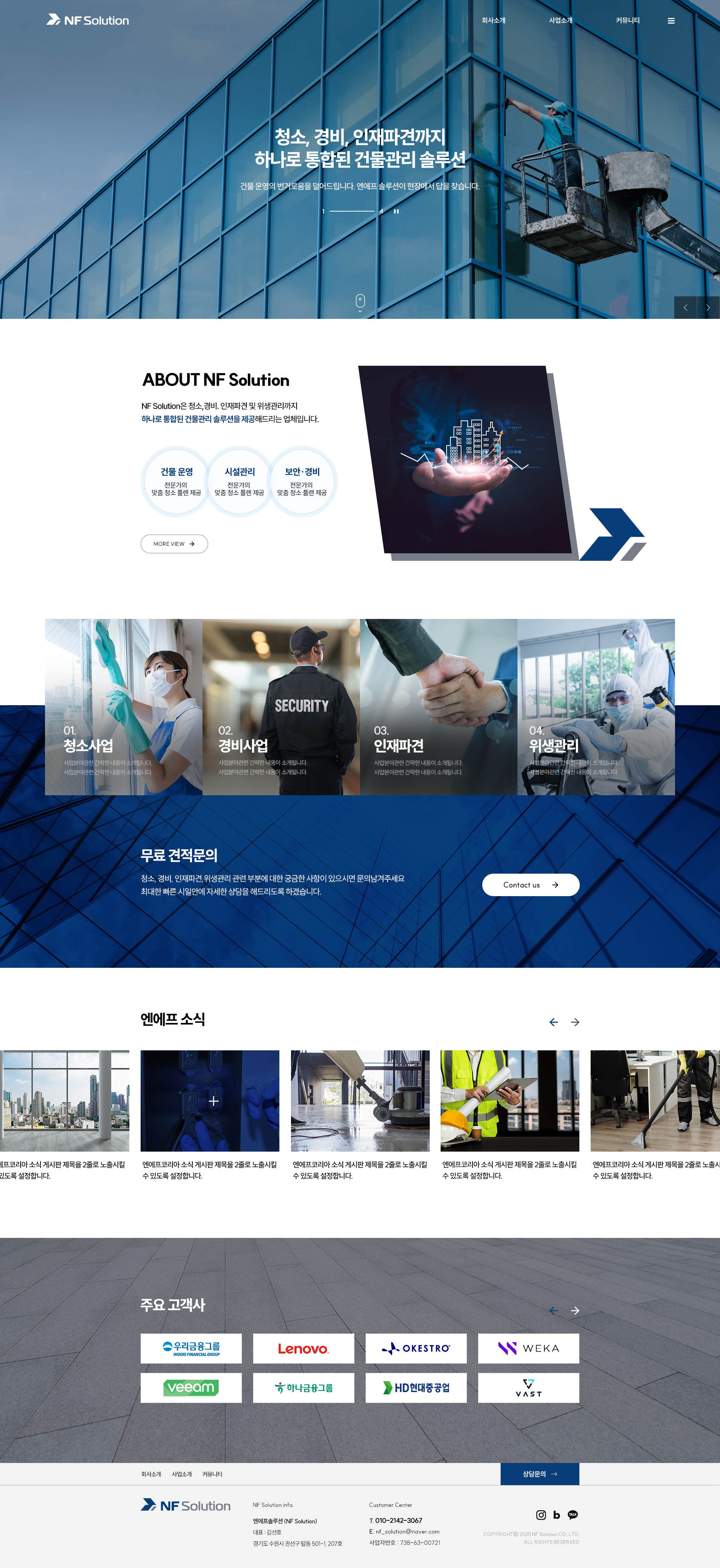 엔에프솔루션은 청소, 경비, 방역소독 및 인재파견까지 하나로 통합된 건물 종합 관리의 파트너입니다.